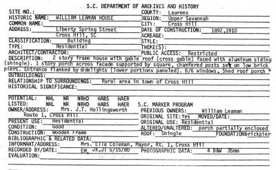 E side of N. Main St./Old Laurens Rd. approx. 1/8 mi. S of its intersection w/ Depot St., Owings, SC (Laurens County)