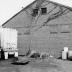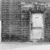 Missing chimney, windows boarded over, brick work around door indicates there may have been some sort of awning or porch cover at one time.