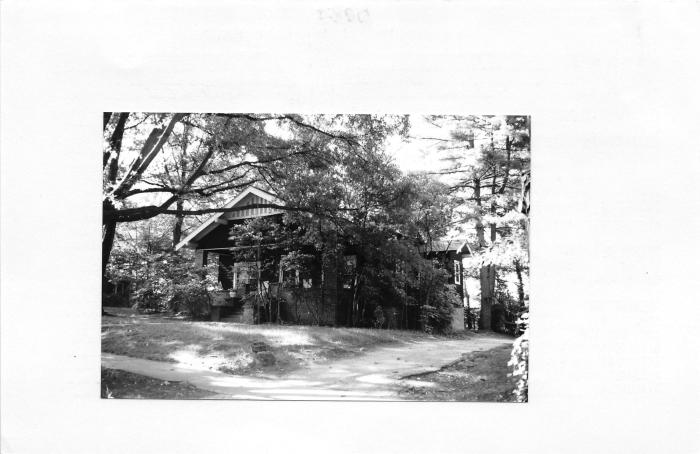 1 story; 1 over 1 lights; purlins; brick porch pillars; square bay on w. side 1 central interior brick chimney; exposed rafters.