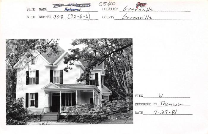 2 1/2 story frame - 1 story pedimented, wraparound porch. Turned post and balustrade, spindled frieze. Offset double leaf doors surrounded by bead and reel decoration and topped by multi-pane transon. Two facade wall gables with returns.