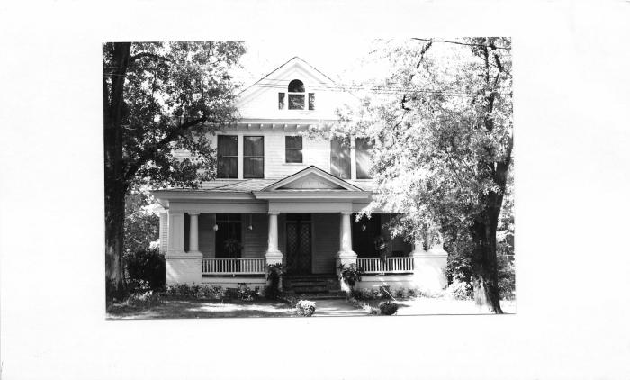 2 1/2 story frame - 1 story pedimented porch with Tuscan and square paneled column supports set in brick piers. Central doorway with diamond paned glass. Transom above. Upper facade shingled. Gable contains Palladian window.;2 story, frame, 2nd story shingled, bay window, pedimented entrance on 1 story porch. Central gable.