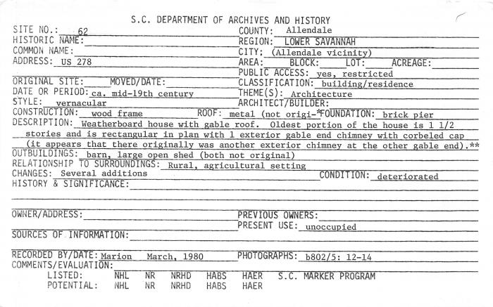 Weatherboard house with gable roof. Oldest portion of the house is 1 1/2 stories and is rectangular in plan with 1 exterior gable end chimney with corbeled cap (it appears that there originally was another exterior chimney at the other gable end). Windows on the 1st floor are 6/9; 2nd floor windows each have a single plain vertical board shutter held in place by 2 handmade wrought iron strap hinges. Front symmetrical; central entrance is flanked on either side by a window; porch, which extends across the front facade features vestiges of sawn ornament in posts and sawn balusters (probably not original). South side: rear shed addition with 1 exterior chimney (not original) and 6/6 window, behind which projects a rectangular addition with metal gable roof and 6/6 windows. North side: a rectangular addition with old 9/9 windows and 1 exterior end chimney (not original) projects out from the northeast corner of the oldest portion of the house. OUTBUILDINGS: barn, large open shed (both not original)