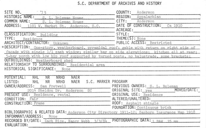 Anderson City Directory 1911-12; Sanborn Insurance Man 1918;None