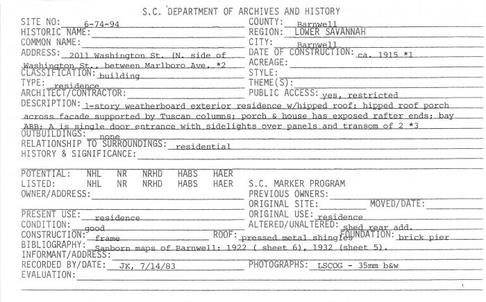 2011 Washington St. (N. side of Washington St., between Marlboro Ave. and Carolina Ave.), Barnwell, SC