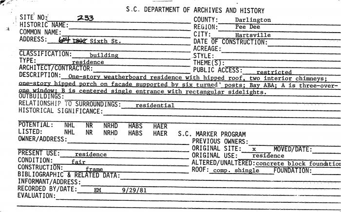 604 Sixth St., Hartsville, SC; 1802 Sixth St., Hartsville, SC