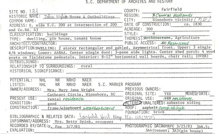 S. side S.C. 200 at intersection of 200 and Co. Rd. 43, Vicinity of Winnsboro, SC
