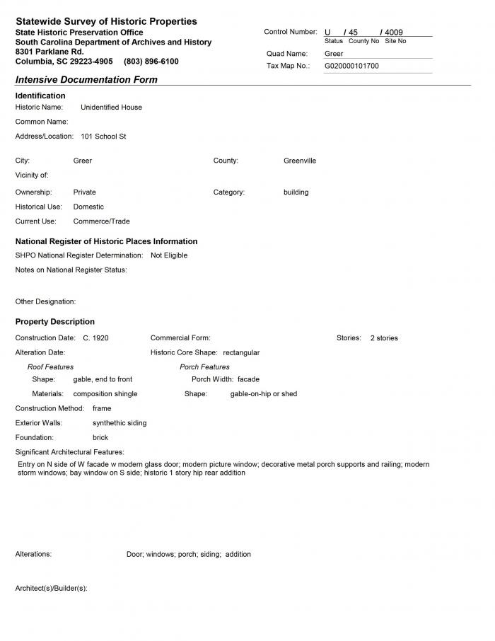 Entry on N side of W facade w modern glass door; modern picture window; decorative metal porch supports and railing; modern storm windows; bay window on S side; historic 1 story hip rear addition