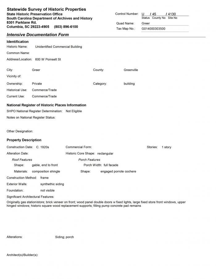Originally gas station/store; brick veneer on front; wood panel double doors w fixed lights, large fixed store front windows, upper hinged windows; historic square wood replacement supports; filling pump concrete pad remains