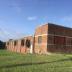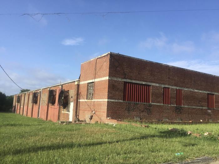Warehouse. Entrance bay projects slightly with entry door recessed. Two stone belt courses define facade. Windows are multi light metal. Loading docks on right and rear elevations. Three segmented arched rooflines can be seen from rear. Industrial fans on left elevation.