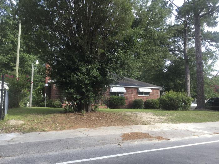 Linear Ranch. Engaged porch. Left bay has 4 light window flanked by 2/2 wood. Other windows covered by aluminum awnings. Left elevation exterior brick chimney. Decorative metal porch supports.