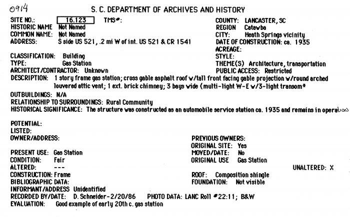 S side US 521, .2 mi W of int US 521 & CR 1541, Heath Springs (Lancaster County)