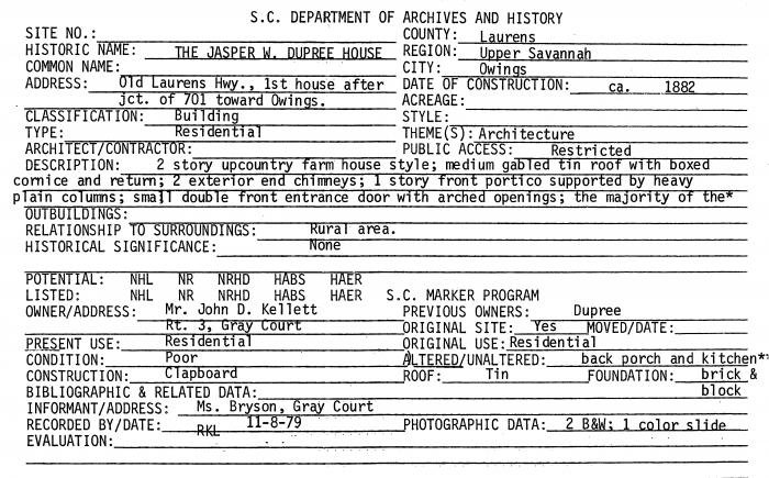 Old Laurens Hwy, 1st house after jct of 701 toward Owings (Laurens County)