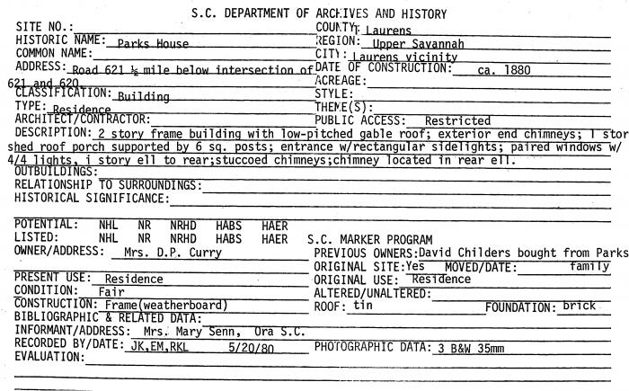 Road 621 1/2 mile below intersection of 621 and 620, (Laurens County)