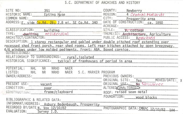 E side co rd 26; 2.8 mi SE co rd 340, Prosperity, SC (Newberry County)