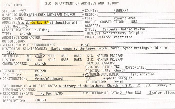 W Side co rd 97 at junction with US Hwy 176, Pomaria, SC (Newberry County)