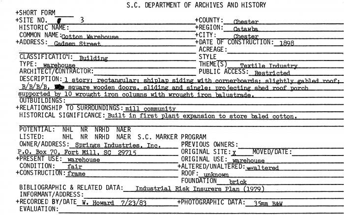 SC Textile Mills and Villages: A Statewide Survey, 1983-1986