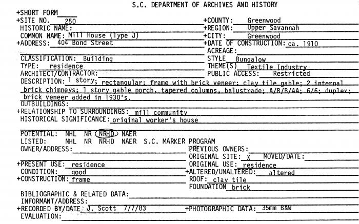 SC Textile Mills and Villages: A Statewide Survey, 1983-1986