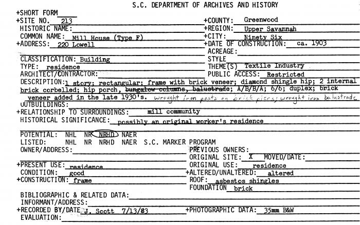 SC Textile Mills and Villages: A Statewide Survey, 1983-1986