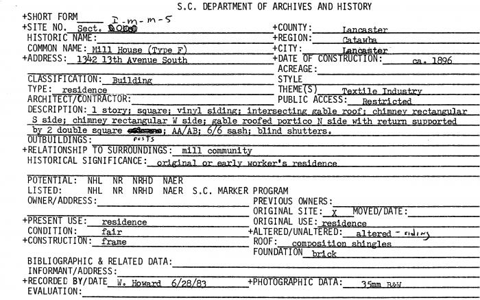 SC Textile Mills and Villages: A Statewide Survey, 1983-1986