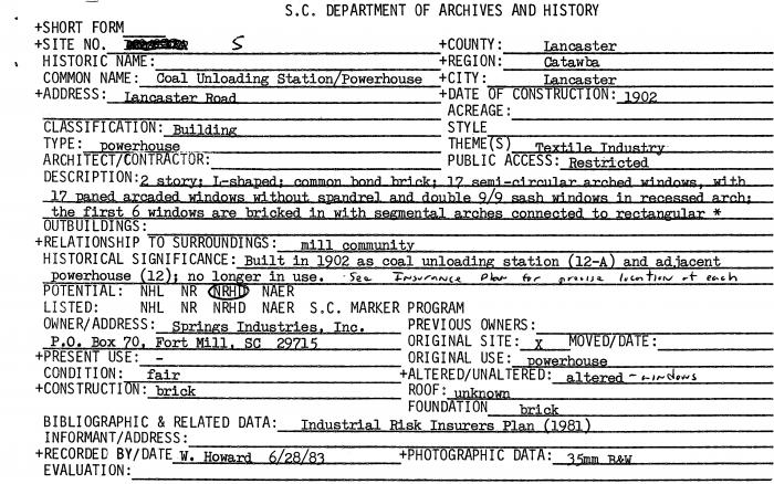 SC Textile Mills and Villages: A Statewide Survey, 1983-1986
