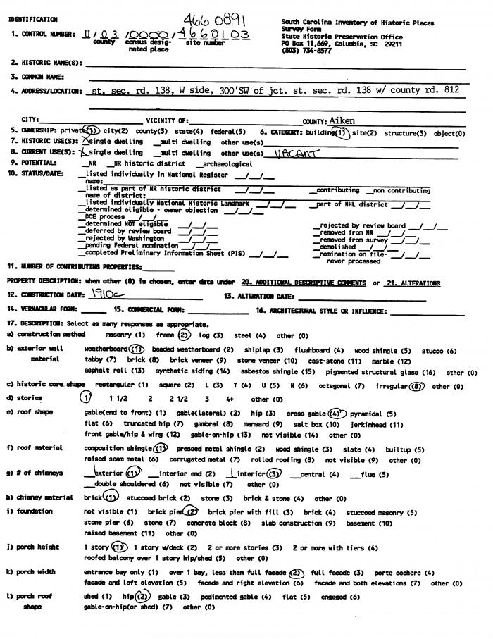 st sec rd 138, W Side, 300 SW of jct st sec rd 138 w/ county rd 812, SC (Aiken County)