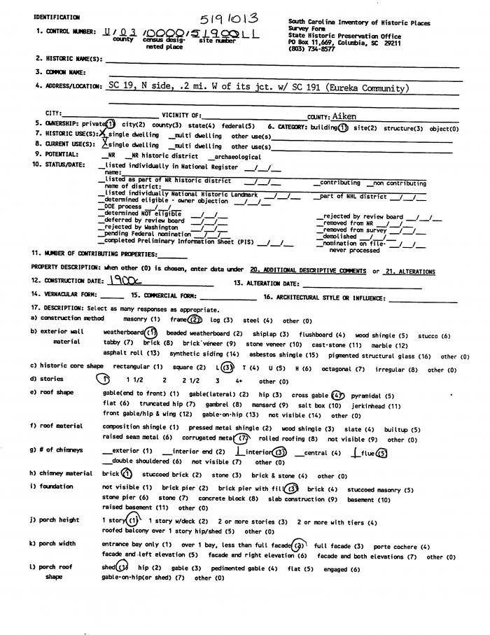 SC 19, N Side .2 mi W of its jct w/ SC 191 (Eureka Community), SC (Aiken County)