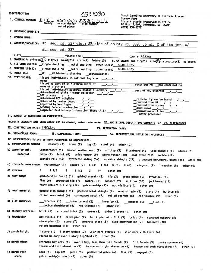 st sec rd 337 vic; SE Side of county rd 889, .6 mi E of its jct w/ st sec rd 337, SC (Aiken County)