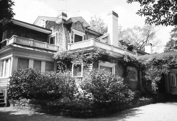 (Rose Hill) The Phelps House is a noteworthy example of the Shingle Style, frequently used in late nineteenth and early twentieth century resort homes for the wealthy, but relatively rare in South Carolina. The Phelps estate, which served as the location for the first meetings of the Garden Club of South Carolina, contains a formal landscaped garden. The elegant home and landscaped grounds are characteristic of many such estates owned by the wealthy in pre-income tax America. The Phelps House was built in the early 1900s on the foundations of an antebellum house destroyed during the Civil War. Designed as a winter home, the two-story house has an exterior surface of wooden shingles broken by windows, gables and doorways trimmed in white. The house contains over twenty rooms. Entrance to the house is through a porte-cochere supported by Doric columns. Original owner of the house, Mrs. Sheffield Phelps, landscaped the grounds and formal gardens containing camellias, azaleas, hollies, and English boxwood. The Phelps family spent from November to May in Aiken and usually spent summers in Bar Harbor, Maine or Europe. Outbuildings include original stables, garage, kennels, three greenhouses, toolhouses, and a children’s playhouse. Listed in the National Register June 10, 1974.