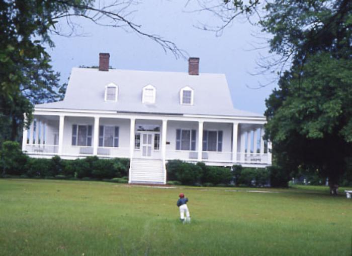(Erwinton Plantation & Hunting Club) Erwinton is a one and one-half story, white clapboard structure built upon a raised brick basement. It was constructed ca. 1828 by Dr. William Robinson Erwin. The front façade is characterized by three dormers and a piazza that extends its entire length as well as halfway down each of the side facades. Fourteen square wooden columns extend along the piazza, and similar pilasters ornament the corners of the house and frame the doorways. Erwinton is an example of Bahamian-influenced raised cottage style of architecture. This style was prevalent in the Southeast, particularly on the coast, during the nineteenth century. The dormers were added during the 1950s. Dr. William Erwin, the original owner of Erwinton, his wife and sister-in-law were all excommunicated from Kirkland Church in 1833 for their affiliation with other denominations. They then formed the second Christian congregation, the Disciples of Christ, in South Carolina. They held weekly meetings at Erwinton until 1835 when the present meeting house was completed and dedicated as Antioch Christian Church. Listed in the National Register May 24, 1976.