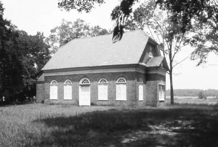 Pompion Hill Chapel, erected in 1763-1765, is a miniature Georgian masterpiece, original and unaltered. The chapel, built on a typical rectangular plan, is probably the finest and best preserved of South Carolina’s numerous small, eighteenth century country parish, brick churches. The first Anglican church outside Charleston was built in 1703 on Pompion Hill. In 1706 the Church of England became the established church in South Carolina and nine parishes were laid off, of which St. Thomas’s Parish containing the 1703 wooden church, was one. Construction on the existing church began in 1763 and was completed in 1765. The Chapel is a one-story Georgian brick structure with a jerkinhead roof and a rectangular plan. The brick walls are laid in Flemish bond and the roof is still covered with slate. The brick was provided by Zachariah Villepontoux, a noted brick maker with kilns at his Paranassus Plantation on the Black River. The master mason was William Axson. Constructed of red cedar, the pulpit is modeled after that of St. Michael’s Church in Charleston. All interior woodwork and nearly all of the furnishings are original. The exterior of the chapel is also largely original and unaltered. Listed in the National Register April 15, 1970; Designated a National Historic Landmark April 15, 1970.