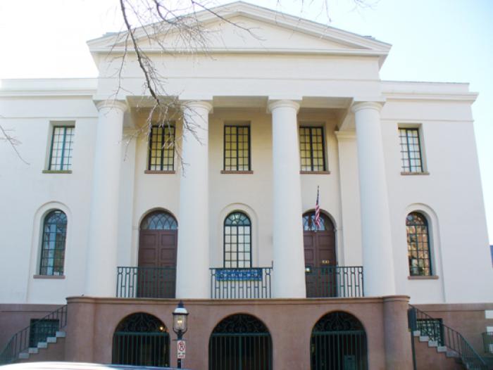 (S.C. Historical Society) The Fireproof Building was the most fire protected building in the country at the time of its construction and is believed to be the oldest building of fireproof construction in the United States. This building was designed by Robert Mills (the first native American trained as an architect) and is very characteristic of his work. Both the high columnar portico raised on a basement arcade and the triple window treatment of the central window mass are typical of Mills’ work. The Fireproof Building is built of solid masonry in an avowed attempt to be fire resistant since Mills was intensely concerned for the safety of the public records housed in the building. The basement, porticoes, and cornices are of stone. The walls are of brick, stuccoed in imitation of the same. The design is in the simple Greek Doric style, without ornament, except that afforded by the porticoes which face each front. These porticoes are composed of four massy columns three-and-a-half feet in diameter, raised on an arcade; the columns rise the whole height of the building (comprising two stories) surmounted by their entablature, and crowned with a pediment. Listed in the National Register July 29, 1969; Designated a National Historic Landmark November 7, 1973.