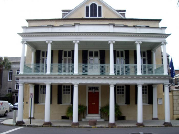The Branford-Horry House was built for William Branford, a wealthy planter, in 1765-67 and is rated one of Charleston’s finest examples of a three-story brick Georgian townhouse, or “double house.” In 1801 it was purchased by Thomas Horry, who had married Branford’s daughter. His son, Elias Horry, president of the South Carolina Canal and Railroad Company, inherited the house and altered it somewhat. The house was owned by the Horry family until 1853. The house is a three-story Georgian brick building with stucco-covered walls. It is three steps above street level, five bays wide and four bays deep. The typical Charleston double house plan includes a bisecting center hall flanked by a pair of rooms on either side. The hall is divided by an arch at the midpoint; stairway in is rear portion, against north partition wall. The third floor contains four bedrooms. The first story windows have exterior paneled shutters; shutters of upper floor windows are louvered. The original appearance of the street façade was greatly altered in 1831-34 by the construction of two-story Regency style porches extending over the sidewalk. Listed in the National Register October 15, 1970.