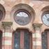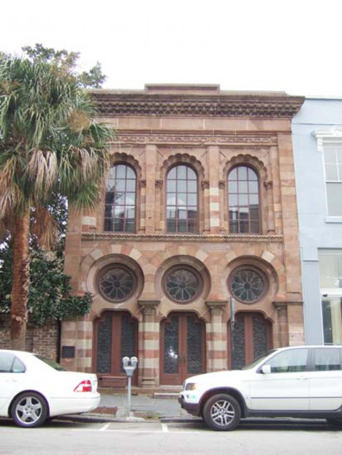 The building was designed by Edward C. Jones and Francis D. Lee in 1853 and was completed in 1854. Both of these architects were Charlestonians. The Farmers’ and Exchange Bank is perhaps the only example of the Moorish picturesque style that evolved from one aspect of English Regency architecture. The building is stucco on brick and brownstone, with a flat roof, a two-story Moorish arcaded façade, and a high skylighted banking room with elaborate plaster decoration employing Spanish and Moorish motifs. The building has rounded horseshoe arches, reminiscent of Spanish architecture, on a façade made of pale Jersey and somber Connecticut brownstone, producing the striped effect which is typical of many Moorish structures. The rear wing has the conventional Classical Revival style. This building has long been recognized to be of utmost importance to American architecture and its design is though to have been influenced by illustrations in Washington Irving’s The Alhambra, a volume which was published about the same time that the building was constructed. Listed in the National Register November 7, 1973; Designated a National Historic Landmark November 7, 1973.