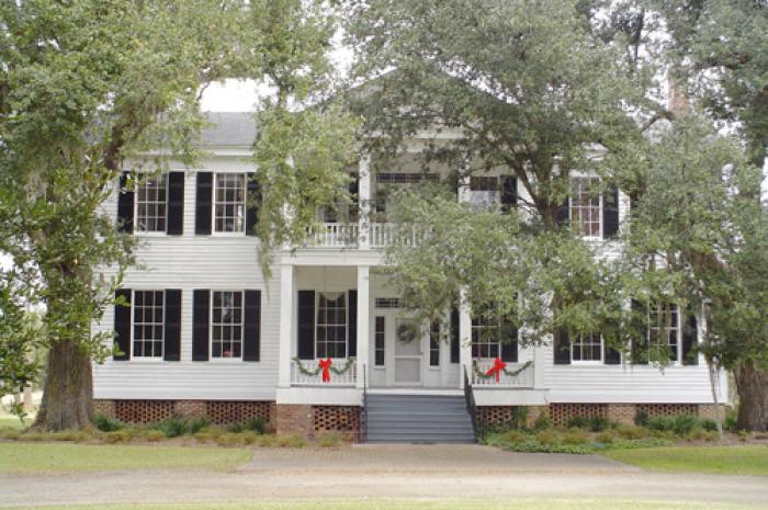 (El Recuerdo) The Davis House is believed to have been built ca. 1843 for Edward Bertrand Davis. The house is a good example of a vernacular antebellum plantation house characterized by Greek Revival elements and is also associated with Davis, a locally known planter and militia officer. In 1853, Davis raised the Black River Troop of the 5th Regiment of the South Carolina Militia and served as its captain until 1858 when he was elevated to the command of the Fifth Regiment. He headed this regiment until his death in 1860. The Davis House is a two-story, frame house with a heavy timber braced frame weatherboard sheathing, and a gabled roof. The foundations are brick piers. The rear or east elevation has one-story, gabled-roofed ells at either side, connected to the main block by shed-roofed connectors. The façade features a central, two-tiered portico with four pillars on each level, a plain balustrade, and a pedimented gable roof. The boxed cornice is carried around the entire house and is raked in the gable ends. Enclosed brick chimneys are located at the north and south ends of the house. These chimneys have recessed stuccoed panels on all faces. The broad entrance hall features a double staircase which rises at each side of the hall and merges at a back landing where a single flight rises to the second floor. An original frame, gabled roof and gabled porch outbuilding on the property is intact, although the original use of the building is unknown. Listed in the National Register January 13, 1983.