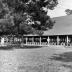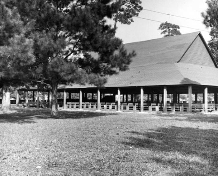 Architecturally, the design of Indian Fields reflects its use as a setting for a collective religious experience. A sense of community is heightened by the circle of adjacent cabins. Constructed in 1848, Indian Fields Methodist Camp Ground retains the nineteenth century layout of ninety-nine wooden cabins, or tents as they are called, which form a circle around a large wooden pavilion, the preaching stand or tabernacle. The simplicity of the rough-hewn cabins and the open tabernacle is a part of the unpretentious style of evangelism that attracted a popular following. The original Indian Fields Camp Ground, located two miles away, was functional as early as 1810. In this year, Francis Asbury, who led the organization of American Methodism through itinerant preaching known as “riding circuits,” preached at Indian Fields. Even after many other stops on the circuits had become established churches, the meeting camp retained a tremendous influence on the development of religious life. Serving crowds too large for church buildings or homes, the campground responded to both religious and social needs. The ambiance of an antebellum campground such as Indian fields was a unique part of the American collective experience. Listed in the National Register March 30, 1973.