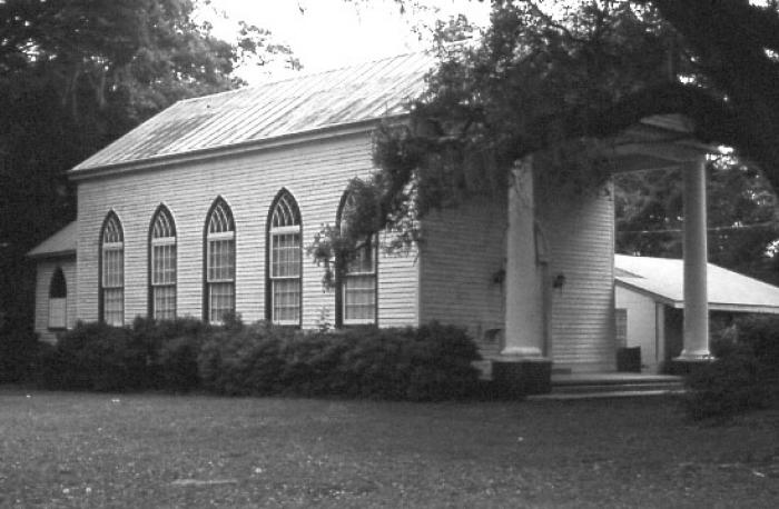 Known as the “Mother of Churches” in the area, Robertville Baptist Church, organized in 1781 by the Rev. Alexander Scott, served the areas early settlers, mostly Welsh and Huguenots. First called Black Swamp Baptist Church, the name was changed in 1934 to Robertville, honoring the Robert family, all lineal descendants of Pierre Robert, a Huguenot minister who emigrated to America after the revocation of the edict of Nantes. The present church building, constructed ca. 1847, was formerly Ascension Episcopal Church of Gillisonville, purchased by Robertville Baptists and moved to its present location about 1867. Remaining unaltered and designed with graceful simplicity, the little church gains its charm from an unusual but successful blending of styles: the Greek Revival with Gothic Revival details. The portico is supported by only two Doric columns (without capitals) on pedestals. The double front paneled door is crowned by a lancet arch. The Gothic detail is repeated in the gable ornament above and in the windows. All interior wood is said to be original. Listed in the National Register February 23, 1972.