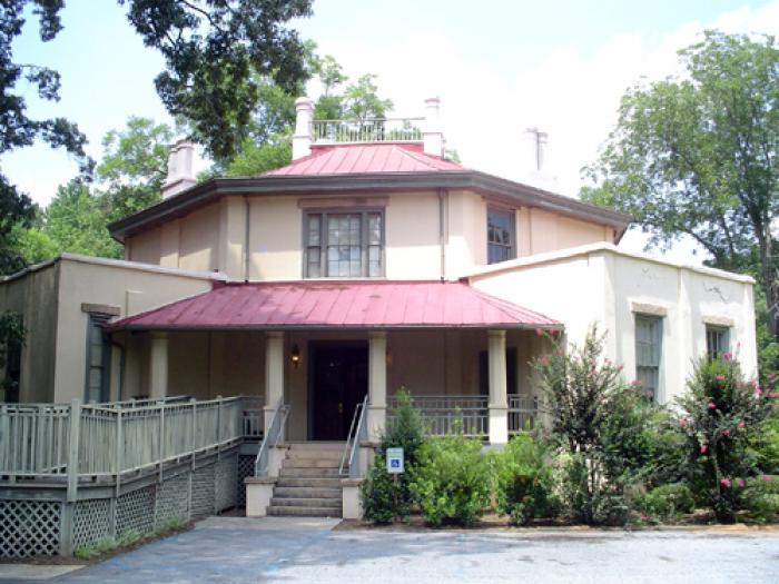 (Holmes-Watson House) The Octagon House, constructed in 1859, is considered to be the first concrete house built is South Carolina. This eight-sided structure with hipped roof has four porches and four extended rooms on the first floor level and a central octagonal core for the second-floor level. The octagonal design is maintained throughout, even down to the eight-sided porch columns and chimneys. Window design and placement varies in each façade, but all have granite sills and lintels. A large square skylight that illuminates the interior central hall of both floors crowns the upper roof. The octagonal motif that is so prominent on the exterior is muted inside the house. Below the first floor are basement rooms with outside access only. Most of these rooms were originally used as domestic slave quarters, but one small one built entirely of field stone served as an ice house and collection point for moisture which accumulated in the concrete walls and was transferred to this location by a series of drain pipes. While the house displays several interesting architectural features, it is primarily significant as an early appearance of the method of construction utilized by the designer and builder, Zelotes Lee Holmes, a Presbyterian minister and educator of upcountry South Carolina. The walls are from 12 to 15 inches thick and include hollow passages that provide a cooling ventilation system throughout the house. As one of the first concrete houses in South Carolina, the Octagon House stands as a landmark to a structural technique that did not fully mature in the state until the twentieth century. Listed in the National Register March 20, 1973.