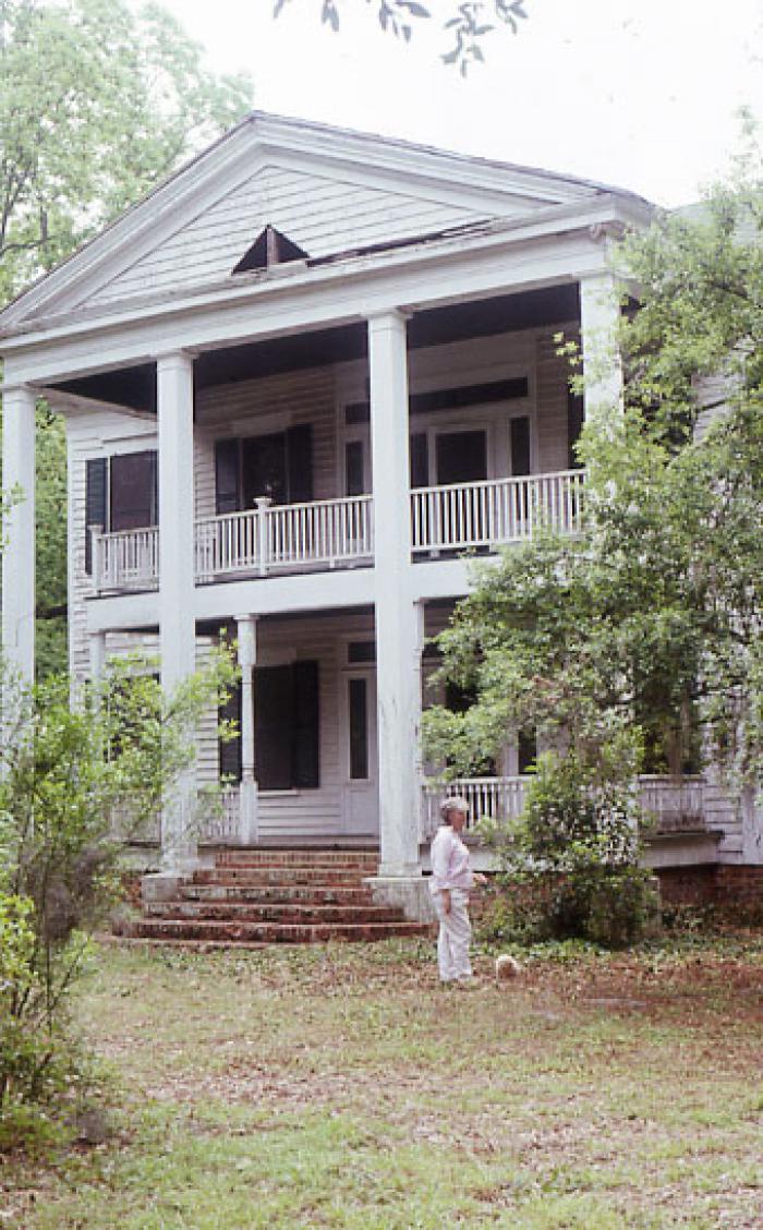 (Ellison Durant Smith House) Tanglewood Plantation was built by the Rev. William H. Smith (1819-1882) c. 1850. A two-story clapboard structure, Tanglewood was the home of several outstanding South Carolinians who were involved in both religious and political affairs. Among these were Ellison Durant “Cotton Ed” Smith, United States Senator from 1908 to 1944, and Alexander Coke Smith, Bishop of the Methodist Conference from 1902 until 1906. The house is typically Greek Revival in style, featuring a two-story pedimented front portico with symmetrical bays on either side, double entrance on both floors, and interior decorative motifs. The portico is supported by four square columns on freestanding brick piers and is divided into an upper and lower gallery. The house is supported by brick piers, the spaces between which have been filled in with new brick construction. Twin interior chimneys with corbeled caps protrude through the roof at its crest. There are also two exterior chimneys. A two-story projecting wing was added to the west façade in 1915, as well as a kitchen ell alteration to the south (rear) façade. Outbuildings include a pine clapboard kitchen building, a round-cut log constructed smokehouse, and a one-room schoolhouse. Listed in the National Register September 22, 1977.