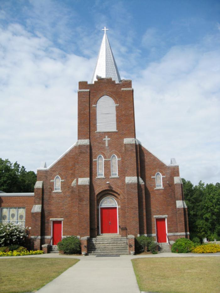Cedar Grove Lutheran Church, erected 1926-27, is significant not only for its architectural sophistication, but also for its connections to Louis H. Asbury, a prominent Charlotte, North Carolina architect whose influential designs shaped the institutional architectural trends throughout the Carolinas during the early twentieth century. The church purchased the plans Asbury used in the construction of the St. John’s Lutheran Church in Statesville, North Carolina, in 1922. In addition, the adjacent Cedar Grove Cemetery is an essential contributing resource that retains its historical integrity as a vast cemetery of several hundred tombstones, which has been the traditional burying ground for Cedar Grove’s congregation since their relocation to this site (from Salem Lutheran Church) in 1857. This Late Gothic Revival building is an outstanding example of early twentieth-century Lutheran sanctuaries in rural South Carolina. Its prominent façade is characterized by a crenelated belfry capped by a multi-faceted metal shingle-clad spire with a cross finial. The belfry’s merlons and crenels are surmounted by limestone coping, a detail that is repeated throughout the building’s exterior in the amortizements on its dual oblique brick buttress piers that flank the central doorway and the northeast and southeast corners of the building. A large brick pointed, stilted arch with limestone imposts and a limestone sill surrounds the metal vent within which lie the mechanicals of the belfry. Each window is capped by a double layer pointed arch resting on limestone imposts, as well as a limestone sill. The interior of the sanctuary features a magnificent open-raftered ceiling with trussed beams suggestive of flying buttresses ending in bracketed pendant posts. Listed in the National Register November 17, 2010.