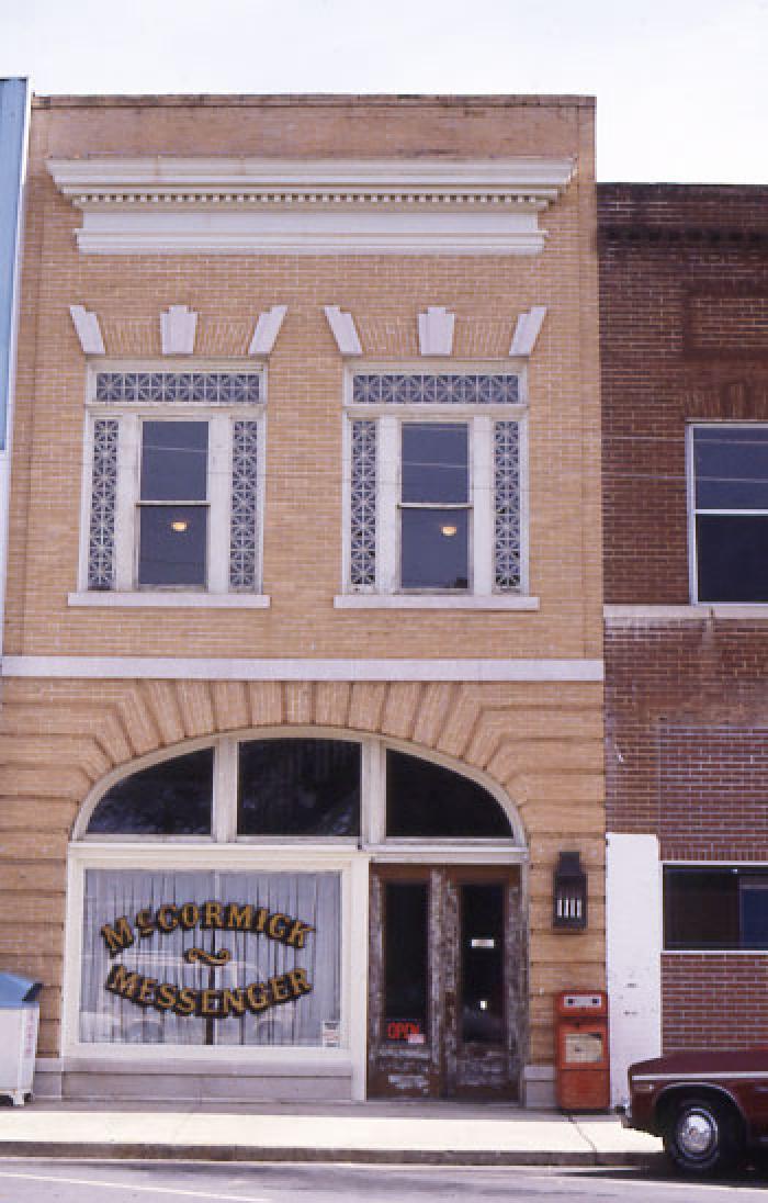 (McCormick Messenger Building) The Farmer’s Bank building is a two-story frame and masonry building constructed ca. 1911. The storefront is composed of large frame and glass double doors, plate glass display windows and three-light transom. The storefront is encompassed by a large rounded arch with radiating voussoirs and quoins. On the second story are two windows with jack arching and keystones. The windows are one-over-one sash with decorative “English Jack” design sidelights and transoms. Above the windows is a sheet metal cornice with dentils. The interior has retained its original staircase and bank vault. The Farmer’s Bank was organized in McCormick in 1907 and was one of two banks which operated in McCormick in the early 1900s. The original bank building was constructed in 1908 and stood until the fire of February 1910, which destroyed most of the commercial area. This building was completed in 1911 and reflected the classical influences of the period through its detailing. By 1916 the bank had assets of $25,000 and was a leading financial institution of the newly formed county. Listed in the National Register December 12, 1985.