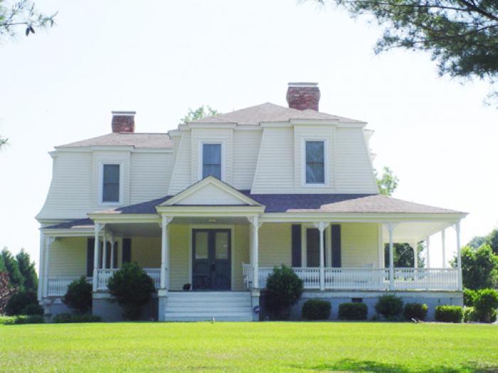 (John Elmore House) Constructed ca. 1880 by C.C. “Cam” Davis for John Elmore, this Second Empire residence is a two-story dwelling, originally with a lower façade of weatherboards under a second story shingled mansard. The mansard was recovered with weatherboards when the original shingles required replacement because of deterioration. Other intact Victorian elements of the house are a front and right side wraparound porch having a lattice frieze, turned posts and balustrade. A pedimented projecting entranceway extends from the porch. The house is the only example of the Second Empire style of architecture appearing in the city locality. The high quality of the interior woodwork is typical of “Cam” Davis’s work in Newberry. Listed in the National Register November 26, 1980.