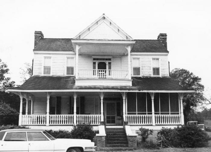 (Shuler-Gilmore House) The Gilmore House, constructed around 1840 and prominently located on Hwy. 176, the Old State Road, is a local landmark thought to be the oldest standing residence in the small town of Holly Hill. The two-story white clapboard house is significant as the location of the town’s first official post office and architecturally as an exponent of the plantation plain, or I-House, house form, as embellished with Victorian era additions, which characterizes much of southeastern rural residential architecture. A ca. 1905 remodeling of the house probably added a long rear kitchen wing and the Victorian embellishments. Given characteristics like the irregular spacing between windows, the house is likely the work of a local builder. Interior spaces maintain a strong sense of their original spaces and detailing. According to a local source, the elaborately carved mantels in the house are said to be the work of Jacob and Frederick Rast, two well-known carpenters in the area at that time. The house’s original owner, Samuel Shuler, was the town’s first official postmaster. Subsequent ownership of the house around 1850 by Dr. James L. B. Gilmore Sr., a planter and physician, placed the house in the Gilmore family whose early descendants were community leaders in commerce and education. Two sheds, a storage building, and a root cellar contribute to the nominated property. Listed in the National Register September 19, 1988. It has since been demolished. Removed from the National Register December 8, 2005.