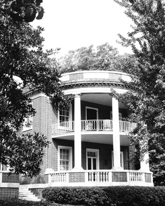 An imposing brick and marble house built for the daughter of a prosperous Columbia banker, the Lyles-Gudmundson house was designed by architect James Brite of New York. Located in Wales Garden, a suburb developed by Edwin Wales Robertson, the house was constructed as a wedding gift for Evelyn Robertson Lyles. Robertson, a Columbia banker, developer and entrepreneur, was responsible for much of Columbia’s early twentieth century development. From October 1918 until January 1921 construction was discontinued due to the difficulties of obtaining materials from Europe. The Lyles family moved in the house in 1922. The two-story Classical Revival style house features English bond brick with marble trim and a semicircular portico with marble columns on the east façade. The four two-story high fluted columns are set on a railing of brick panels and stone balusters. The portico has a full entablature of architrave with guttae, unadorned frieze, and cornice. Above the cornice the brick parapet contains six stone panels ornamented with three garlands. There are two chimneys which extend from the flat roof. A smaller wing on the west is recessed from the main façade. The entrance portico has four marble columns and two pilasters supporting a flat roof which is surrounded by a balustrade. A modified entablature and a brick parapet with marble trim top the building. Listed in the National Register March 2, 1979.