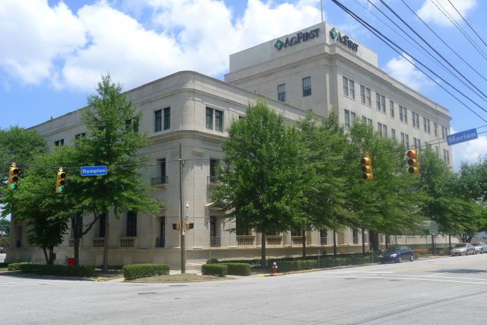 The Federal Land Bank Building, constructed in 1924 and expanded in 1935, is significant for commerce as a district headquarters of the Federal Land Bank. One of twelve district headquarters in the United States, the headquarters in Columbia provided federal financial support to struggling farmers throughout the Third District, composed of South Carolina, North Carolina, Georgia, and Florida. The Federal Land Bank Building is also significant under architecture as an example of Classic Revival public buildings designed by prominent architects A. Ten Eyck Brown (original, three-story 1924 construction) and Columbia-based South Carolina firm Lafaye and Lafaye (five-story, 1935 addition). The building’s successive construction dates reflect changing ideas about the aesthetics of and practical demands placed on public architecture in the 1920s and 1930s. Because the building continuously served as offices for related financial institutions throughout its ninety-year history, it has undergone little alteration. The present building maintains a high degree of architectural integrity and many characteristic elements of the building’s original design remain, including the coffered ceilings, intricate cornice, stone balusters, pilasters, interior vaults, bronze pediment doors, and double-hung wooden sash windows. Listed in the National Register February 3, 2015.