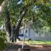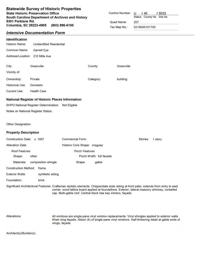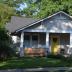 Craftsman bungalow. Interior lateral masonry chimney. Porch- square posts atop brick piers, wood floorboards on concrete slab. Knee braces at roofline of porch.(4) leaded 8-light vertical panes over single pane lower sashes, facade. Rafters exposed.