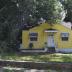 Front-facing gable over front room. Side gabled projection. Hipped roof over entry stoop with decorative metal supports. Stoop has brick foundation. Patio with decorative metal rail across left facade. Windows have metal awnings. Exterior brick chimney.