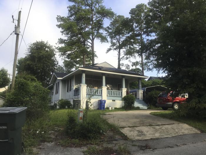 Bungalow. Porch has tapered wood over brick columns with wood railings. 1/1 vinyl windows, 45 light window on left bay.